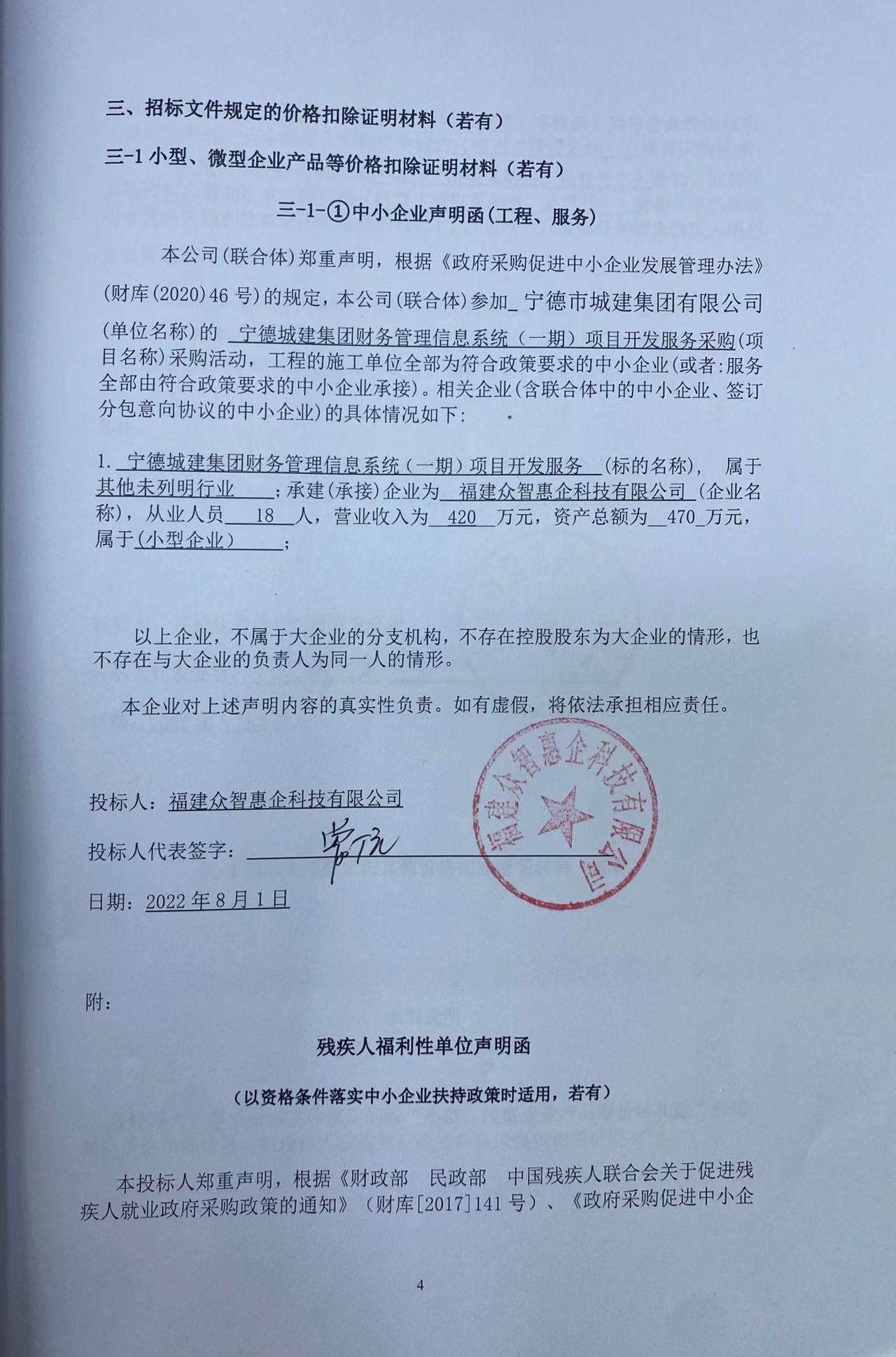 | 1 | 福建眾智惠企科技有限公司 | 寧德城建集團(tuán)財(cái)務(wù)管理信息系統(tǒng)(一期)項(xiàng)目開發(fā)服務(wù)采購項(xiàng)目 | 在組織機(jī)構(gòu)方面,項(xiàng)目將涉及寧德城建集團(tuán)及其下屬分子公司,具體詳中標(biāo)人的投標(biāo)文件。 | 符合招標(biāo)文件要求,具體詳中標(biāo)人的投標(biāo)文件。 | 一年 | 金蝶軟件運(yùn)行維護(hù)服務(wù),包括日常支持、巡檢、緊急修復(fù)、后援服務(wù)、及時(shí)提供產(chǎn)品補(bǔ)丁等,具體詳中標(biāo)人的投標(biāo)文件。 |