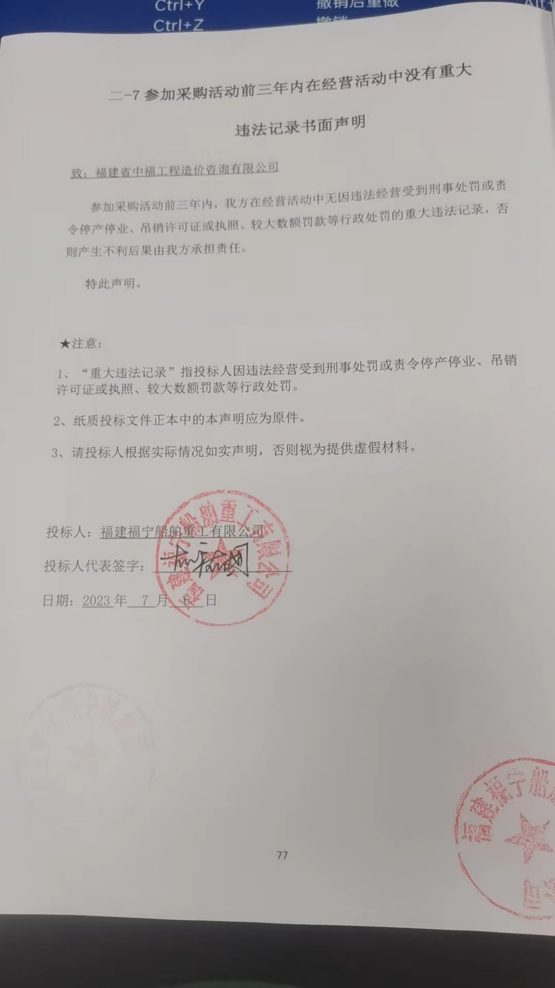 “寧德市建港海洋裝備有限公司”投標(biāo)文件中未提供對(duì)近三年無行賄犯罪記錄的聲明函以及未提供招標(biāo)文件要求的“具備履行合同所必需設(shè)備和專業(yè)技術(shù)能力的證明材料”中的經(jīng)營場所的場地證明材料,資格審查不通過;其余投標(biāo)人資格性及符合性均通過審查。